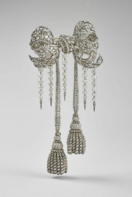 C’est en 1855, que le joaillier François Kramer créa cette sublime broche de corsage destinée à Eugénie, l’épouse de Napoléon III. L’œuvre est qualifiée d’exceptionnelle, elle présente un nœud sculpté “à deux boucles et pans repliés”, elle comporte 2438 diamants et 196 “roses”.