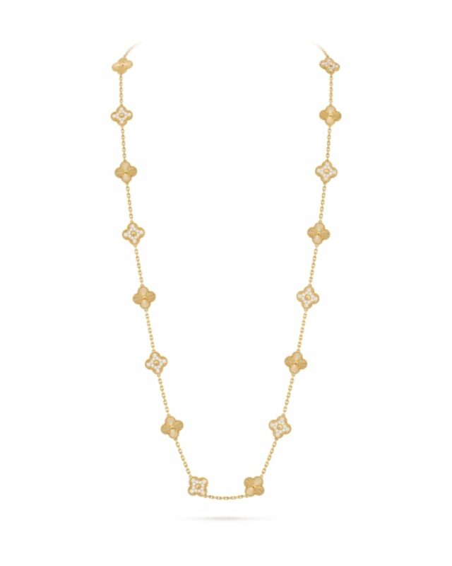 Motif trèfle à quatre feuilles, lignes perlées et pierres ornementales. Symbole de chance et de raffinement, c’est l’une des collections les plus reconnaissables au monde.
