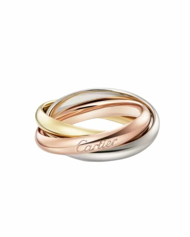 Trois anneaux entrelacés en or jaune, blanc et rose, symbolisant l’amour, la fidélité et l’amitié. Une œuvre de pure élégance intemporelle, devenue un classique absolu.